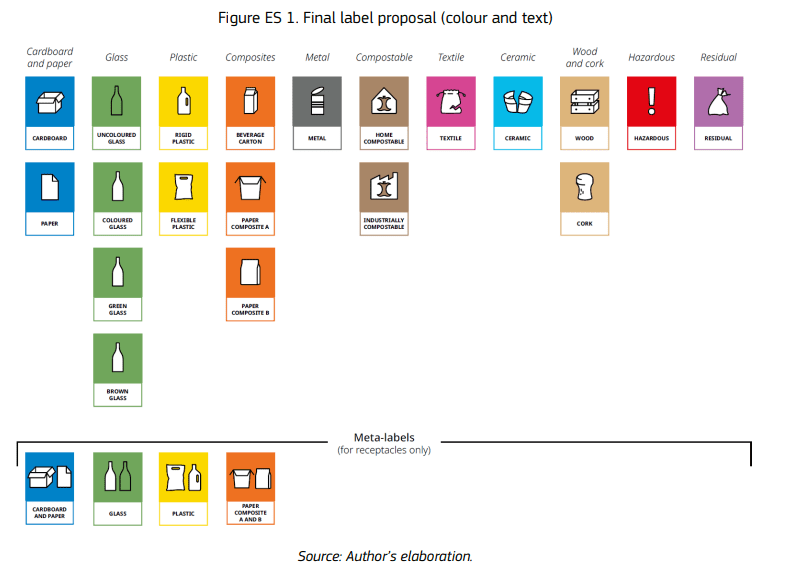 The JRC report proposes harmonised waste-sorting labels which include text and colour: